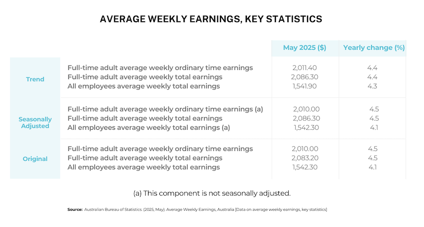 Average weekly ordinary time earnings for full-time adults hit $2010 in May 2025, which was 4.5% higher than the year before, and significantly more than the 2.1% annual inflation rate recorded in the June quarter.