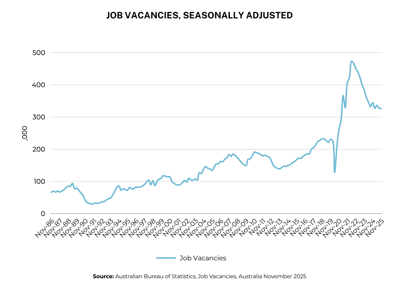 ABS data shows job vacancies ease 0.2% in the November 2025 quarter and were 5.2% lower than a year earlier which suggests falling demand, but context still matter as labor is still tight. It just means that hiring conditions are cooling unevenly – but certainly not collapsing.