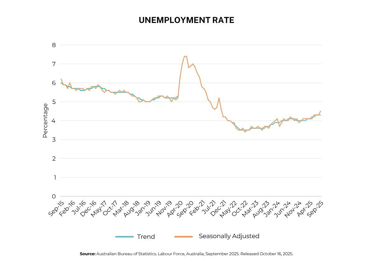 Australia’s job market is showing clear signs of cooling as the unemployment rate rose to 4.5% in September. That is up from 4.3% in August and 4.0% a year earlier, according to the Australian Bureau of Statistics.